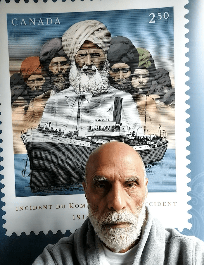Harbhajan Gill with image of the Komagata Maru 100th anniversary postage stamp.