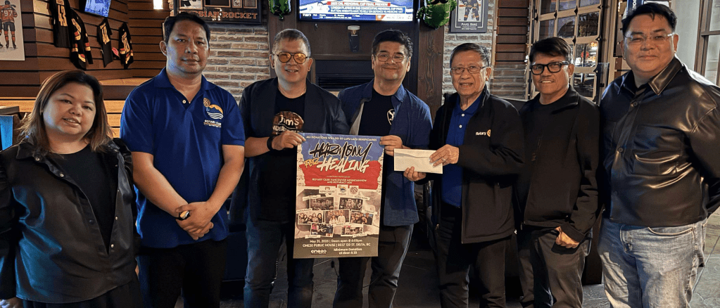 HARMONY FOR HEALING organizers Ted Dichupa of Jim’s Underground (3rd fr left) and Richard Piamonte of Midlife Krisis (middle) turn-over proceeds of the charity concert amounting to almost $5,000 to Rotary Club Vancouver Mountainview (RCVM) President Ernesto Ong (3rd fr right). Also in photo are Rotaract 604 President Christine Castro, RCVM President-Nominee Chris Loredo, Rotarian and Publisher Rey Fortaleza and Rotary Past President/Kabayan Realtor Rovic Canono.