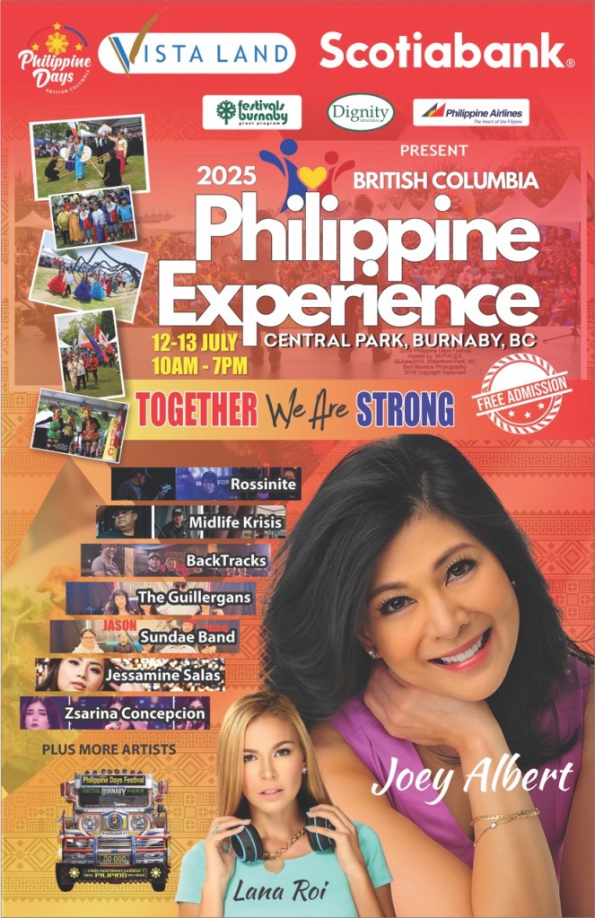 2025 Philippine Experience, Central Park, Burnaby, BC on July 12-13 from 10am to 7pm. Together We Are Strong