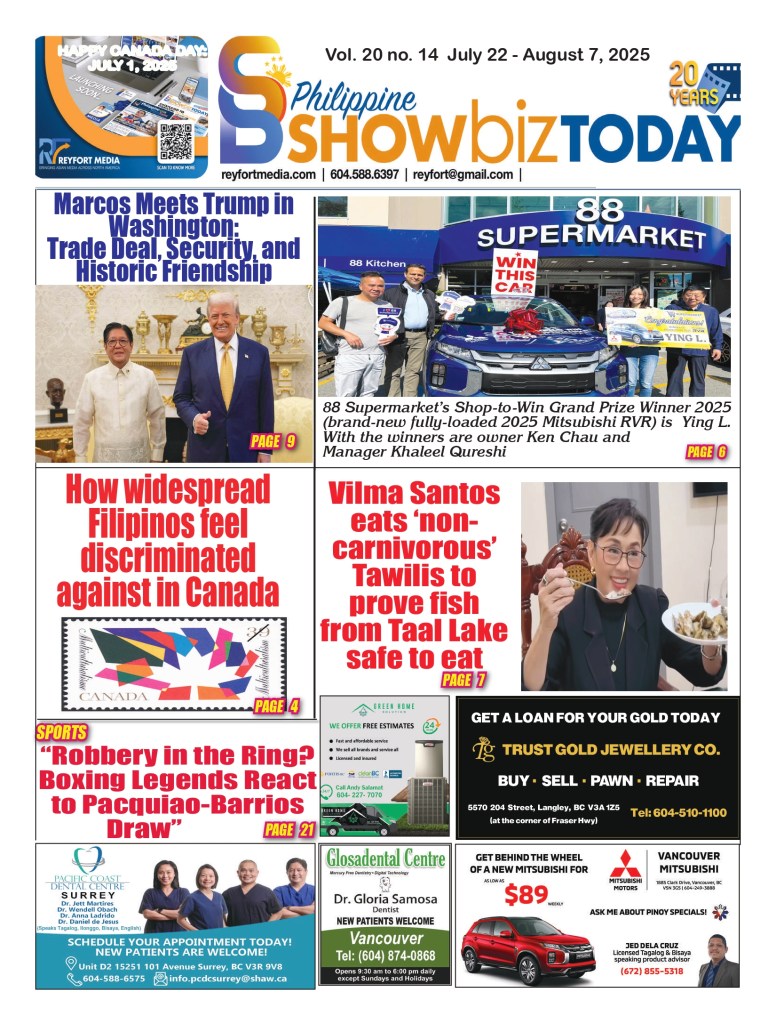 The latest digital issue of Philippine Showbiz Today hard copies are available at your favourite Filipino stores, restaurants, dental clinics, 88 Supermarkets, Save-on Supermarkets, Price Mart, Lucky Supermarket, Foody World and other businesses.