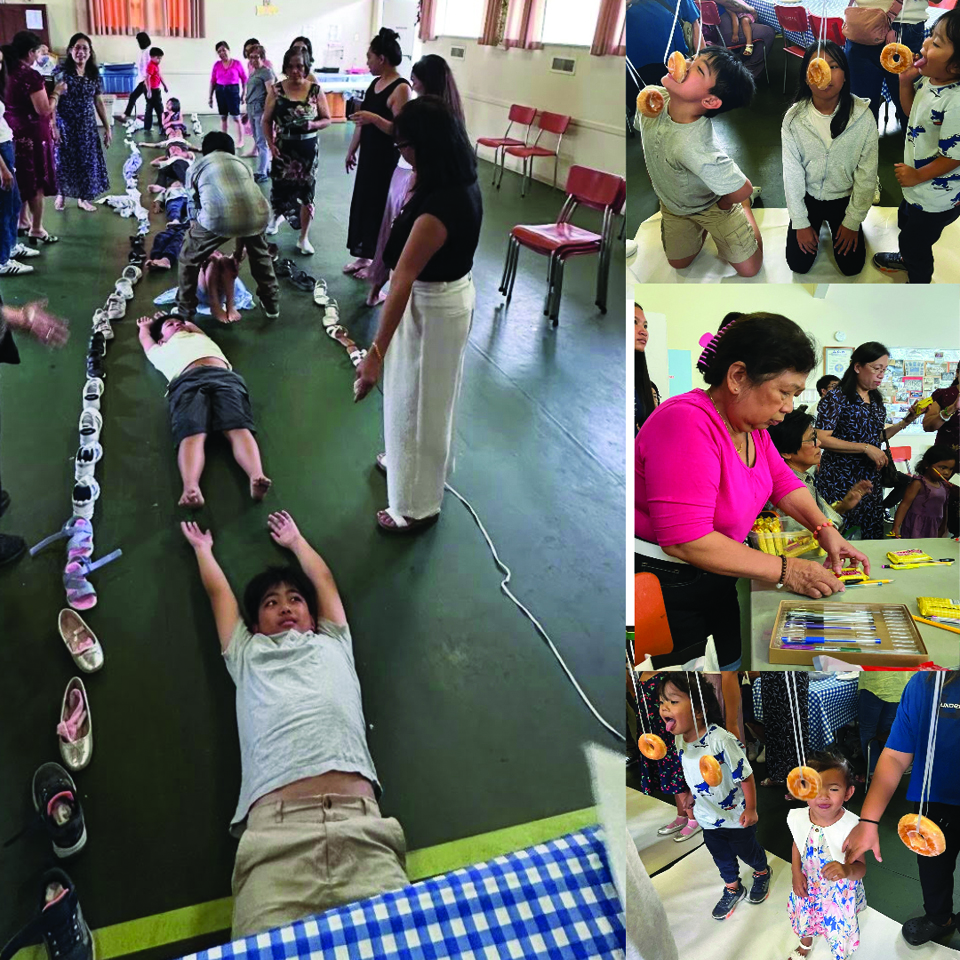 Vancouver, August 30, 2025. — Squeals of delight from the children filled the Upper Hall as the children lined up to eat the “doughnuts on a stick” contest, the first game for the back-to-school indoor picnic at St. Mary the Virgin South Hill church in East Vancouver.
