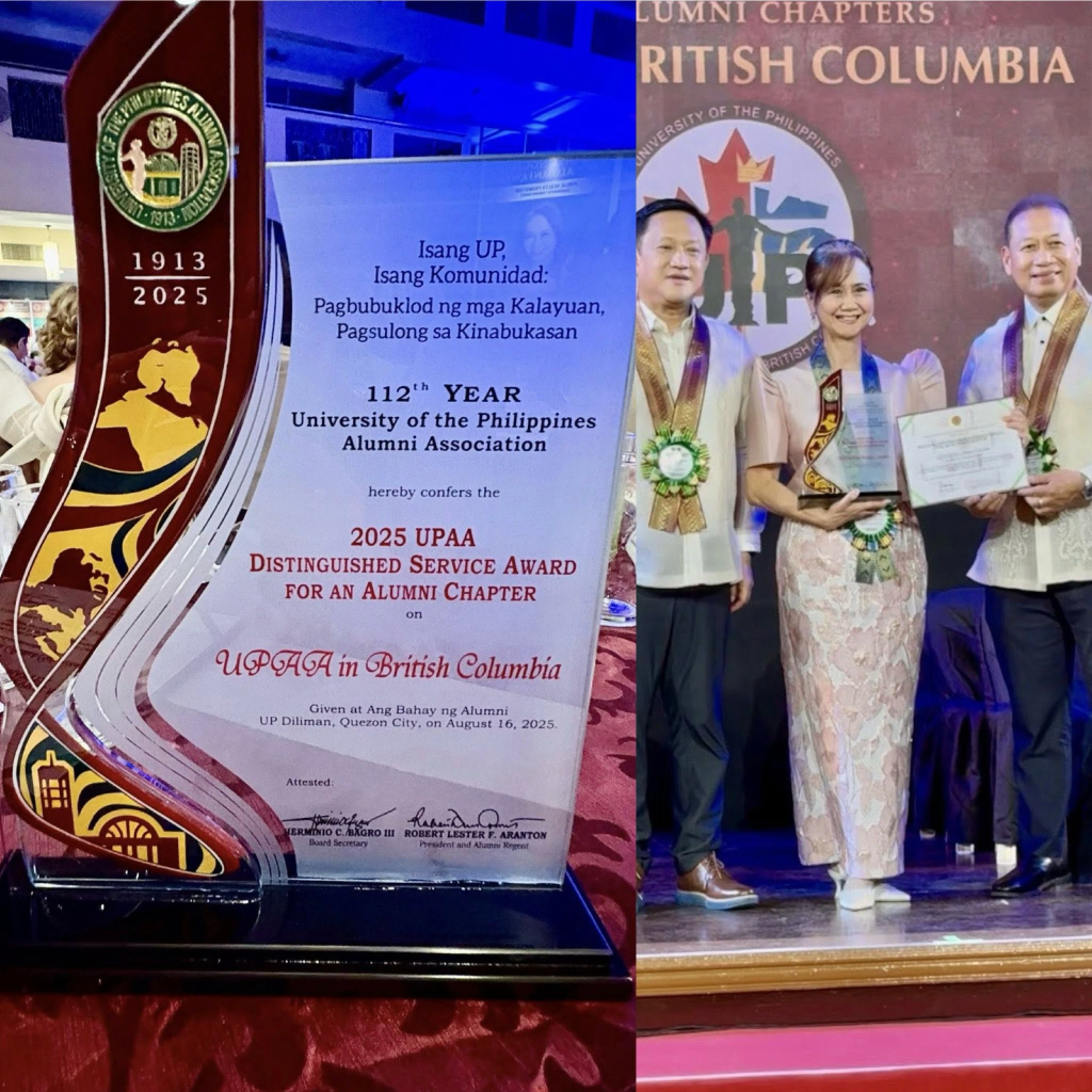 On August 16, 2025, Ms. Anita Aytona represented the UPAABC to receive the prestigious UPAA Distinguished Service Award for an Alumni Chapter given at Ang Bahay ng Alumni, UP Diliman, Quezon City. Simultaneously, Ms. Aytona, current Chairperson of UPAABC’s Scholarship Program, formally launches the run of UPAABC scholarships in UP Los Baños’ College of Engineering and Agro-Industrial Technology and UP Diliman’s College of Fine Arts.