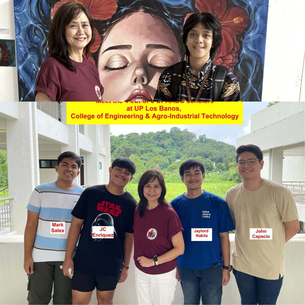 Top: Ms. Aytona with UP Diliman-College of Fine Arts scholar Robert Valencia; Bottom: Ms. Aytona with the first wave of UPAABC’s scholars from UPLB. (Photo from UPAABC Archive)