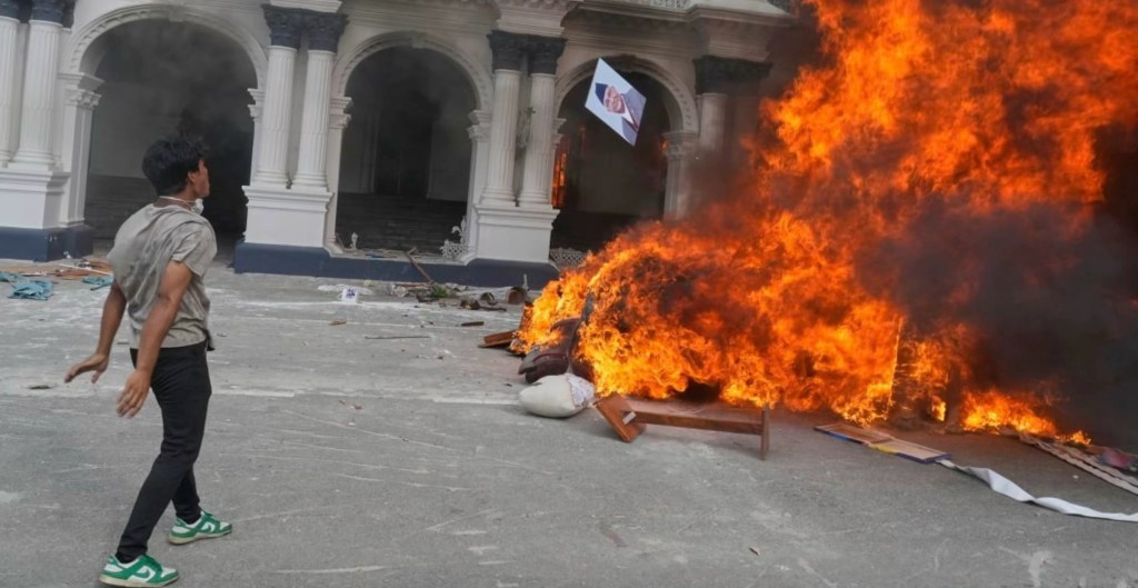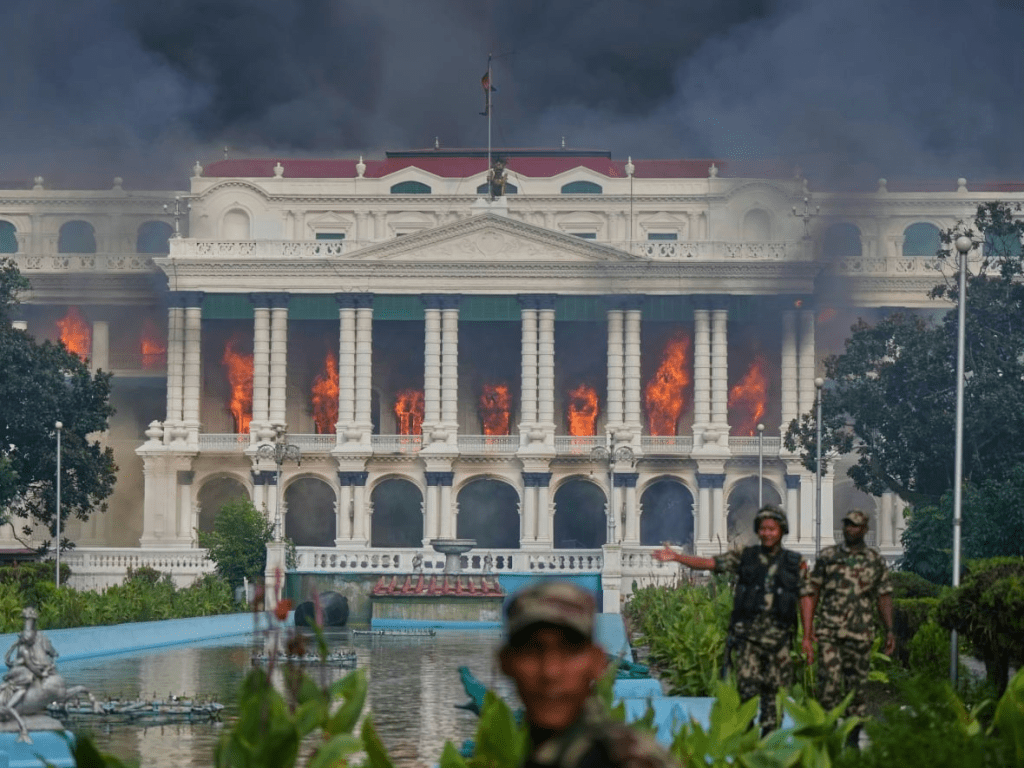 Nepalese military forces attempt to clear demonstrators from Singha Durbar after the government complex was engulfed in flames amid escalating unrest. (Photo by Niranjan Shrestha/The Associated Press from CBC Canada)