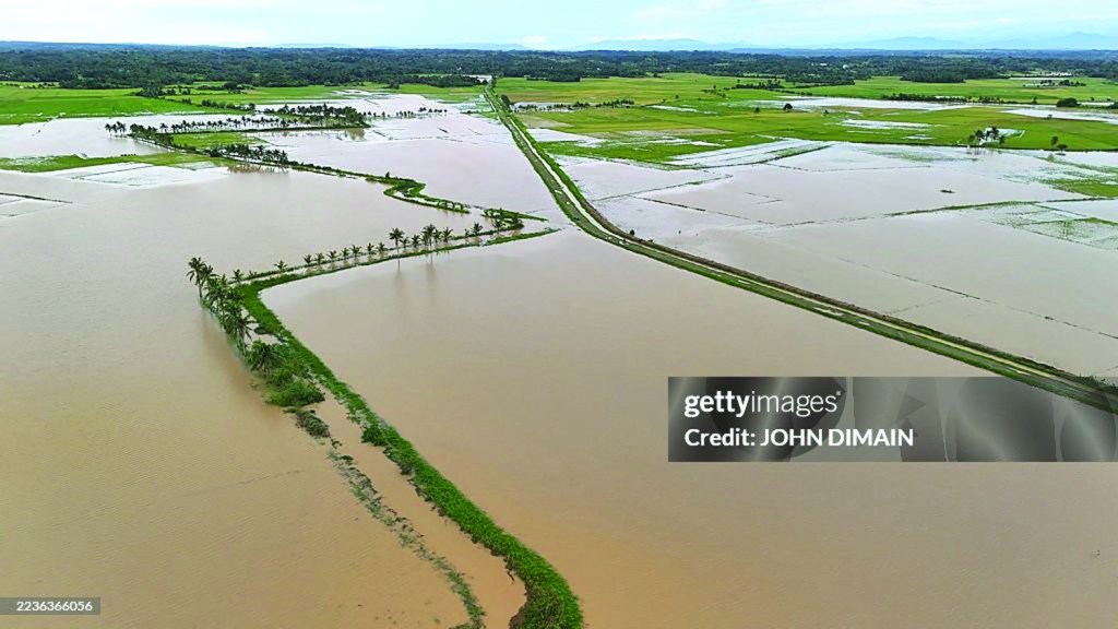 An aerial shot captures submerged rice fields in Calamaniugan, Cagayan, on September 23, 2025, a day after Typhoon Ragasa battered northern Philippines with floods, landslides, and widespread destruction. (Photo by JOHN DIMAIN/AFP via Getty Images.)