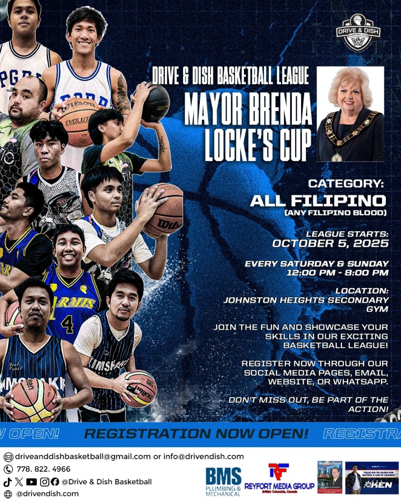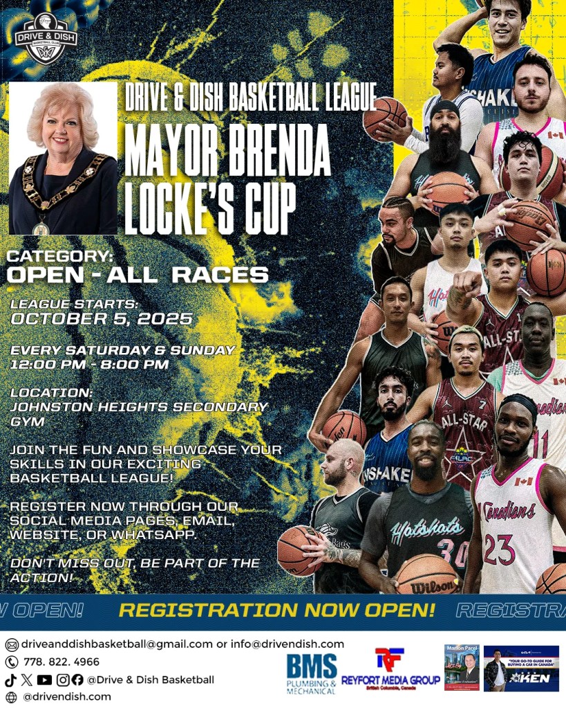 Surrey, BC — Basketball returns to Johnston Heights Secondary Gym with a community-focused slam: Mayor Brenda Locke’s Drive & Dish Mayor’s Cup tips off Sunday, October 5, 2025. The biannual league runs nearly three months with games every Saturday and Sunday from 12:00 PM–8:00 PM.