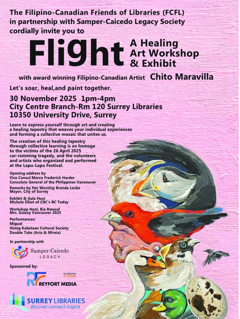 In a first-ever collaboration of the Filipino-Canadian Friends of Libraries (FCFL) and Samper Caicedo Legacy Society (https://sampercaicedolegacy.com/ ) the community and loved ones of victims of the April 26 Lapu-Lapu day tragedy gather for painting workshops led by award-winning Filipino Canadian artist Chito Maravilla, that will culminate in an event dubbed “Flight – A Healing Art Workshop & Exhibit” on 30 November 2025 at 1 – 4 pm, Room 120, Surrey Public Library, Main Branch 10350 University Drive, Surrey, BC.