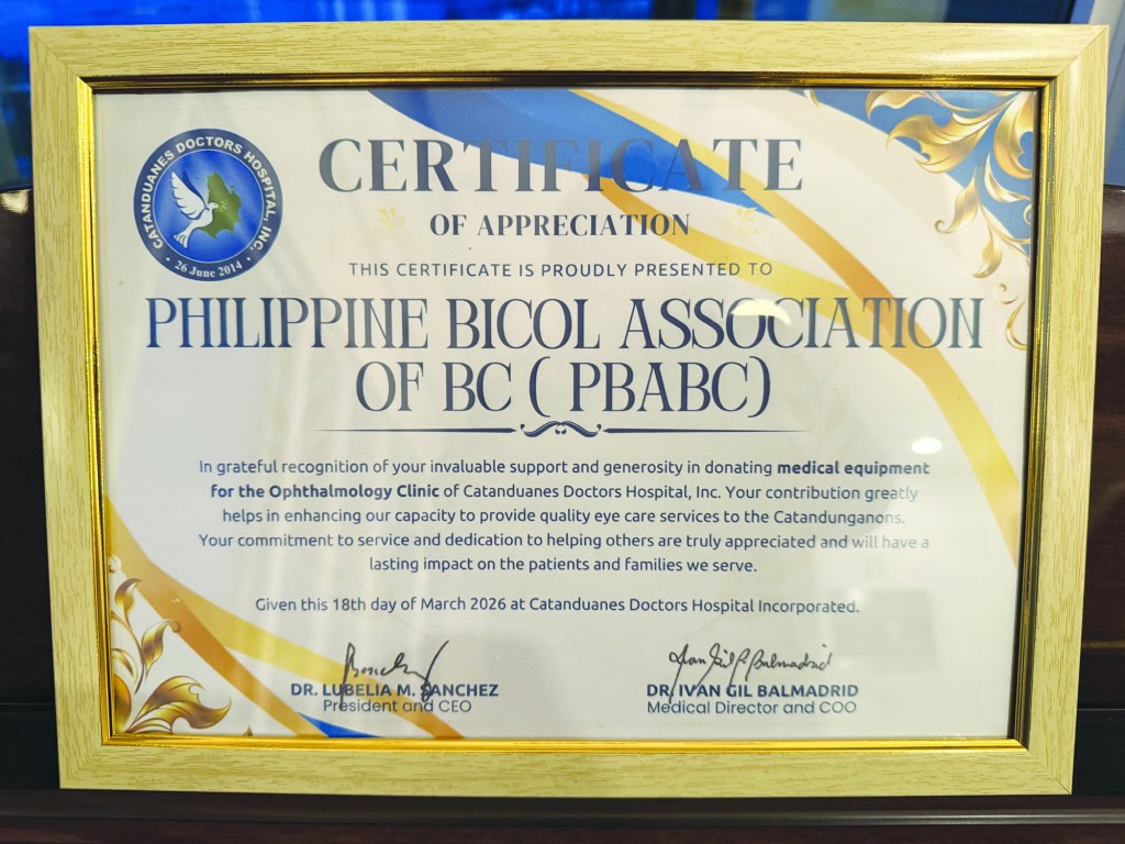 Vancouver, BC – April 2026 — The Philippine Bicol Association of British Columbia (PBABC) continues to demonstrate its commitment to global community service through the donation of two sets of ophthalmology equipment to the Catanduanes Doctors Hospital, Inc., (CDHI) located in Virac which is the capital municipality of the Philippine island province of Catanduanes in the Bicol Region (Region V).